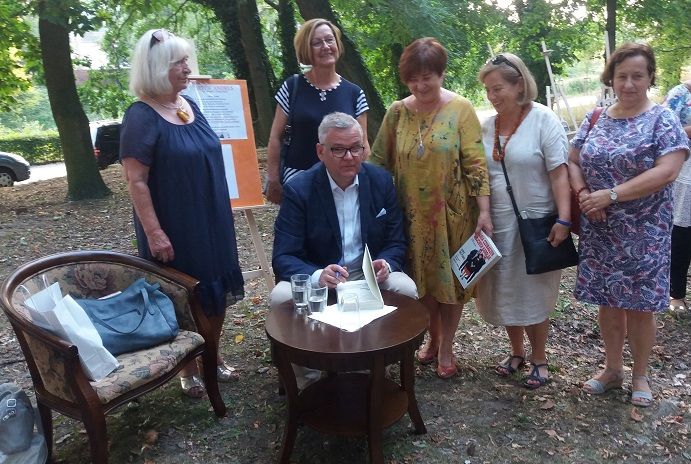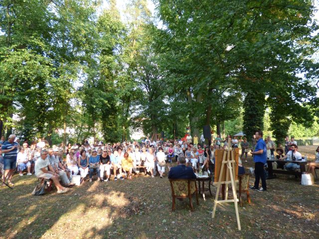 gościliśmy Artura Andrusa, znanego dziennikarza i konferansjera, autora tekstów piosenek, pisarza . Przed spotkaniem przeczytałyśmy książki Artura Andrusa „Każdy szczyt ma swój Czubaszek” i „ Boks na ptaku czyli Każdy szczyt ma swój Czubaszek i Karolak”, które polecamy. Te błyskotliwe rozmowy trójki przyjaciół , pełne humoru, pozytywnych emocji, okraszone ciekawostkami z ich życia prywatnego i zawodowego nie tylko bawią, ale także zmuszają do refleksji. Na tegorocznej imprezie uczestnicy mogli również posłuchać poezji Ewy Roszak-Andrukiewicz i Arkadiusza Pokory z Gubina oraz Edwarda Rudnickiego z Jasienia. Oryginalne, ciekawe grafiki przedstawiające zabytkowe miejsca Gubina i Guben, wykonane na deskach prezentował na wystawie plenerowej Tadeusz Lech. „Szlachcicowi współczesnej mowy wiązanej Arturowi Andrusowi” to tytuł rymowanek i skeczy brawurowo wykonanych przez Halinę Bohutę-Stąpel z Literackiego Kabaretu „Hallo”z Zielonej Góry, przy których śmialiśmy się „do łez”. Licznie zgromadzonej publiczności koleżanki z naszego DKK podarowały wiersze (ręcznie napisane) Zbigniewa Herberta, była to akcja Fundacji im. Z. Herberta i Biblioteki Narodowej. Spotkanie z Arturem Andrusem przy licznych i różnorodnych tematycznie pytaniach od mieszkańców Gubina przebiegło w miłej atmosferze, a zwieńczeniem Wyspy Literackiej było zasadzenie drzewka przez naszego gościa na Wyspie Teatralnej.