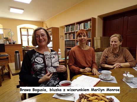 Październikowe spotkanie DKK przebiegało w emocjonalnej atmosferze na temat książki autorki Joyce Carol Oates pt. ’’Blondynka’’. Zdania naszych członkiń klubu były bardzo podzielone, czego dowodziła burzliwa dyskusja. Ale czy o tak znanej osobie jaką była Marilyn Monroe można pisać w zwyczajny sposób. Tym bardziej jeśli autorka stawia sobie za cel ukazanie nieznanego oblicza kontrowersyjnej a równocześnie podziwianej i uwielbianej gwiazdy show biznesu jaką była Marilyn Monroe.