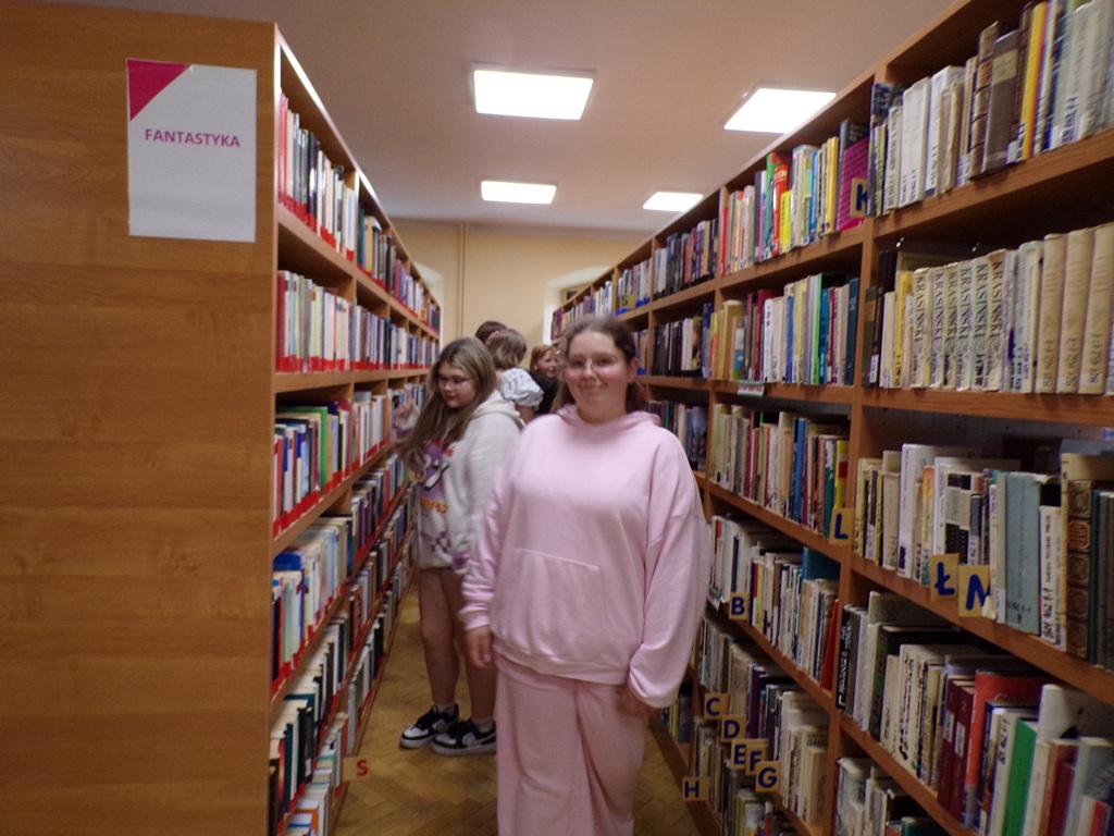 wraz z opiekunką, Martą Smyk. Oprowadzająca po oddziałach biblioteki, Bożena Albinowska, zapoznała uczennice z księgozbiorem i zasadami funkcjonowania placówki. Grupa z ciekawością przechadzała się między regałami oglądając i wertując książki. Cieszy nas, że okazały się one interesujące dla nastolatek i kilka z nich powiększyło grono naszych czytelników.