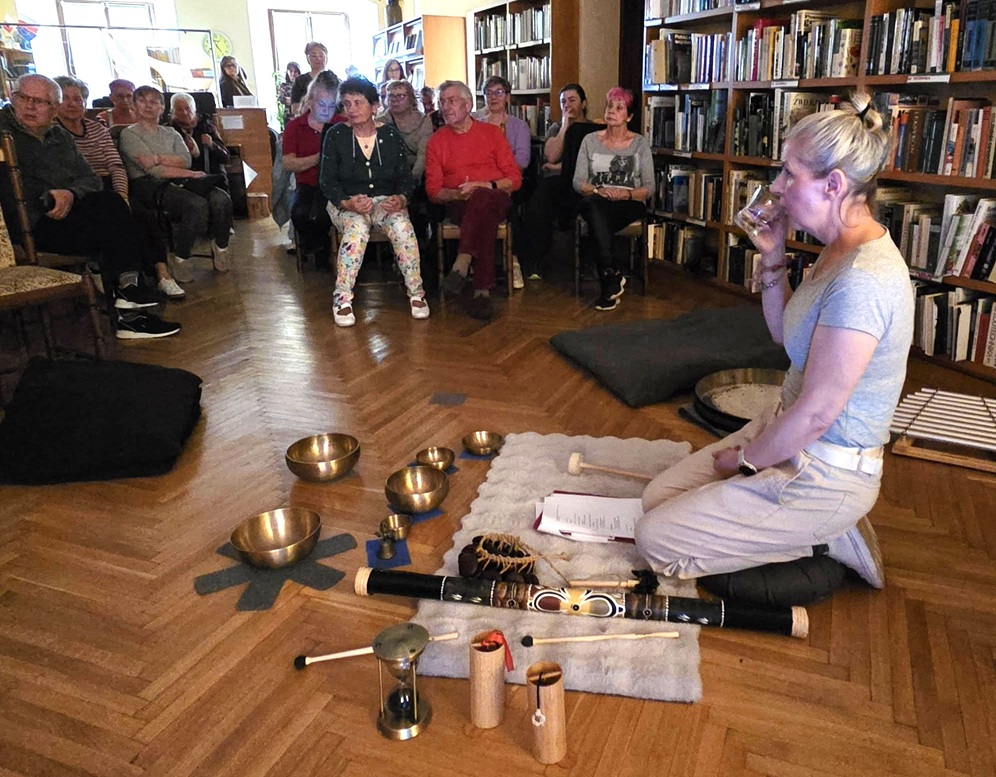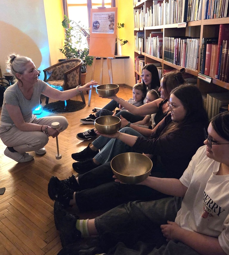 W środę, 15 kwietnia 2026, w bibliotece odbyło się wyjątkowe spotkanie z Izabelą Ratajczyk-Bryll – pedagogiem, psychologiem i dźwiękoterapeutką. Zgromadzona publiczność miała okazję poznać niezwykły świat dźwięków i wibracji. Podczas spotkania Pani Izabela przybliżyła uczestnikom, czym są misy tybetańskie – tradycyjne instrumenty dźwiękowe, wykonywane zazwyczaj ze stopu siedmiu metali, od wieków wykorzystywane w medytacji, relaksacji oraz terapii dźwiękiem.