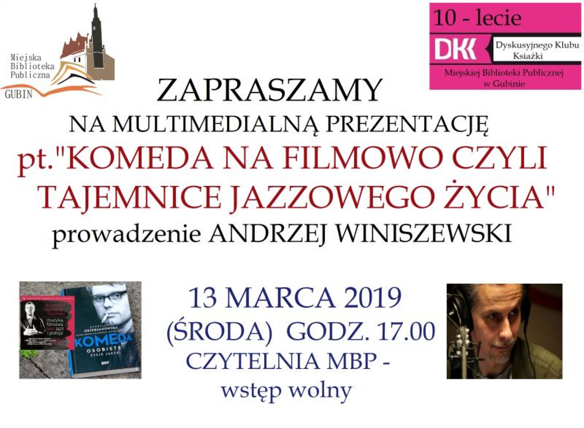 „Komeda na filmowo czyli tajemnice jazzowego życia” to tytuł prezentacji multimedialnej , którą Andrzej Winiszewski – dziennikarz zielonogórskiego Radia Zachód wprowadził nas w jazzowe klimaty. Interesująco i z pasją opowiedziana historia, pełna ciekawostek z życia Krzysztofa Komedy i jego najbliższego otoczenia ( Zofia Komeda, Urszula Dudziak, Marek Hłasko, Roman Polański) przybliżyła licznie zgromadzonej publiczności świat muzyków jazzowych .
