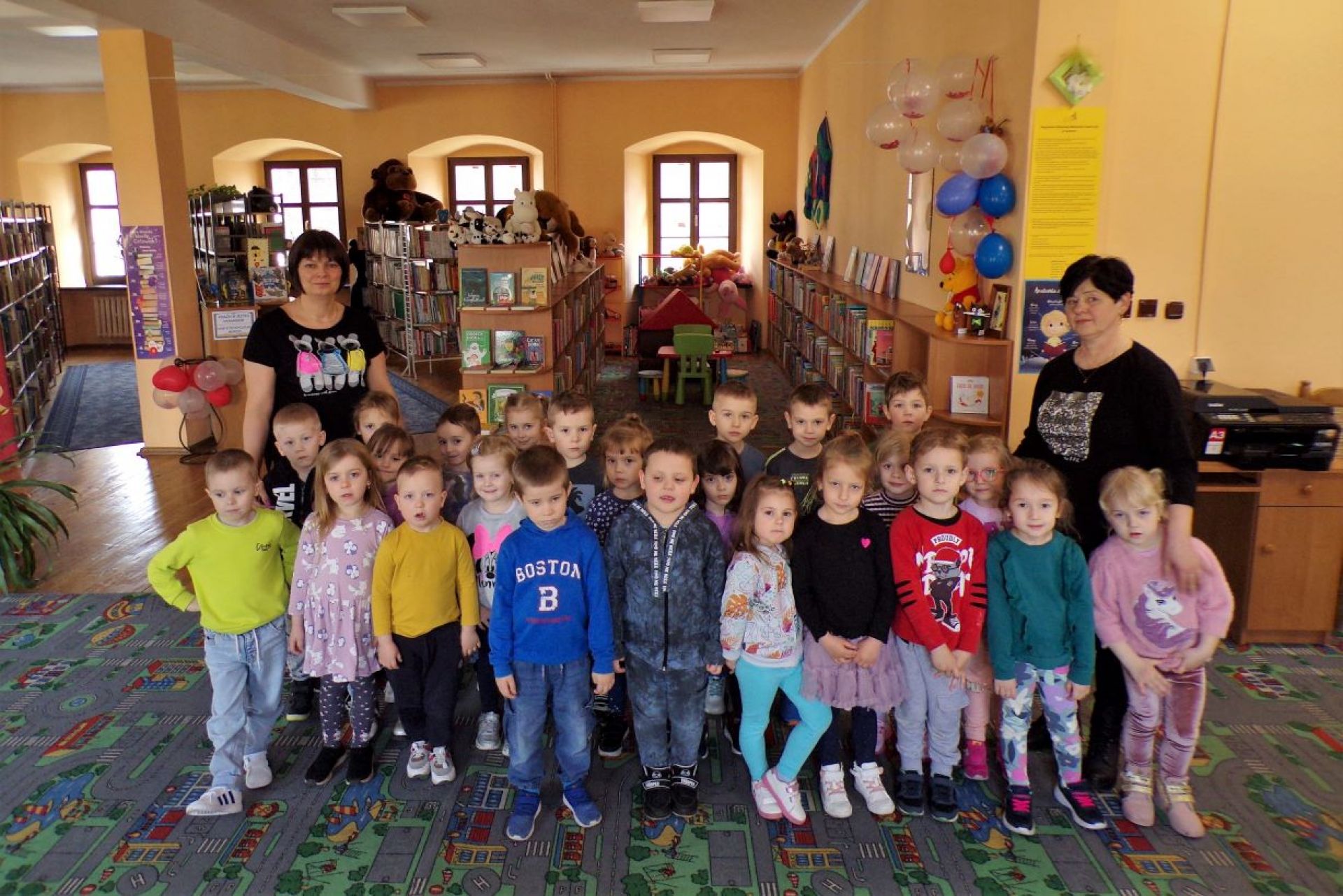 Wspaniałe, grzeczne dzieci chętnie sięgały po bajki znajdujące się w bibliotece starając się zachować porządek na półkach.
