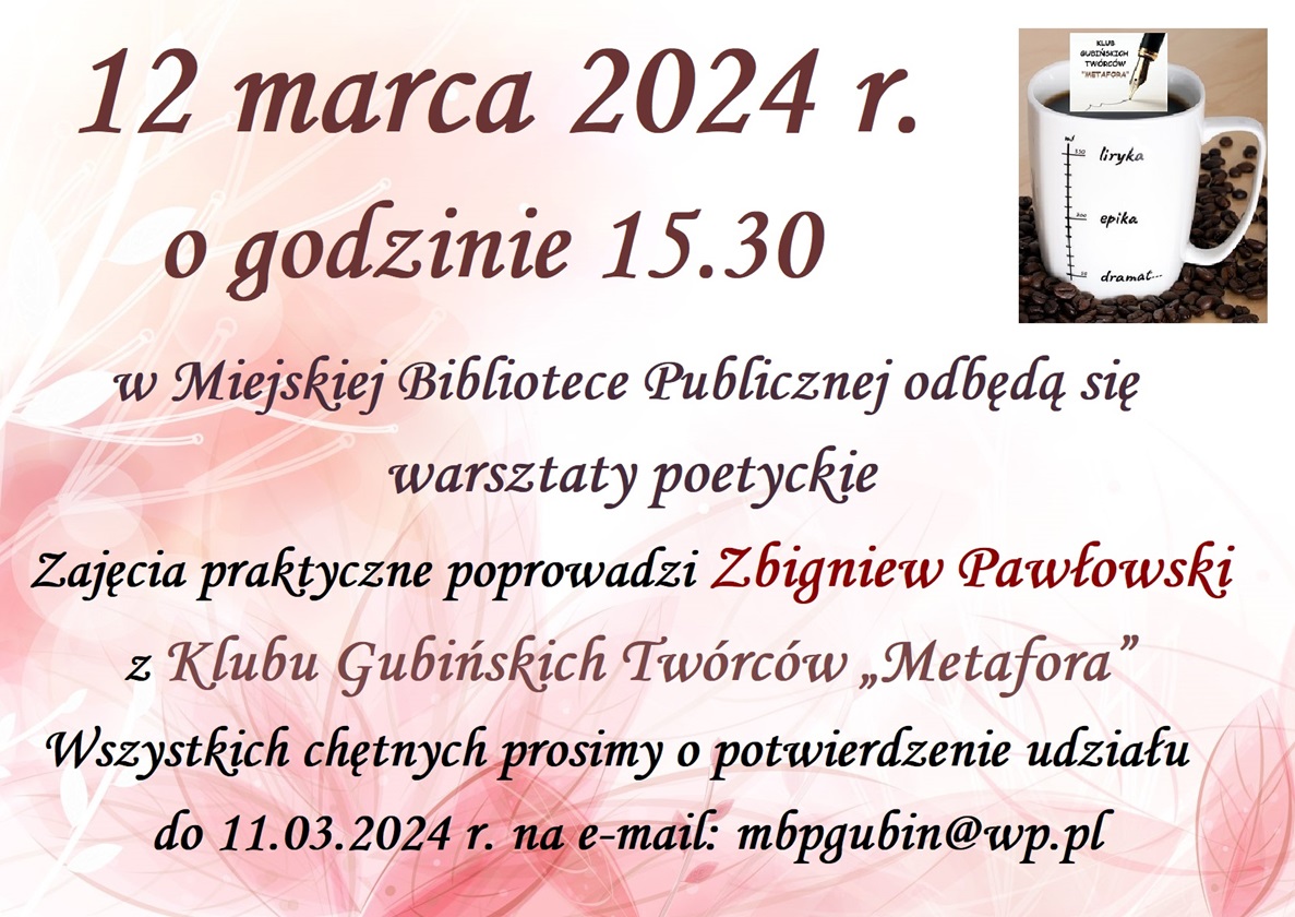 Poetyckie warsztaty piątek, 08 marzec 2024 07:48 Napisał Ewa Dąbek Wydrukuj Email ,,Piszemy, by posmakować życia podwójnie'' Anais Nin Zapraszamy we wtorek. Udostępnij artykuł: Powrót na górę