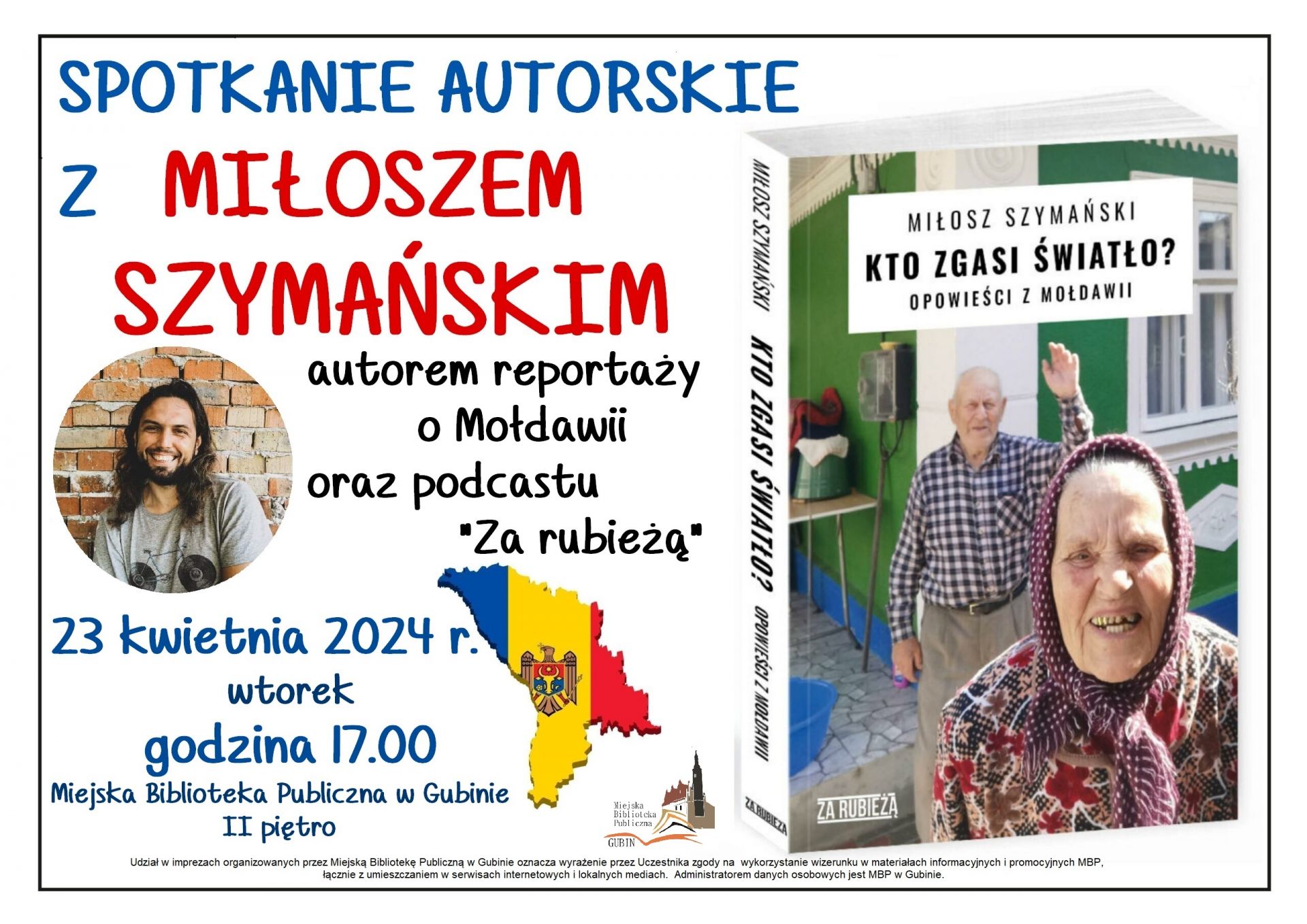 prowadzi podcast Za Rubieżą, jeden z popularniejszych historyczno-politycznych kanałów w Polsce. Jest autorem książki „Kto zgasi światło? Opowieści z Mołdawii”, która jest zbiorem reportaży z Mołdawii. Serdecznie zapraszamy na spotkanie do biblioteki 23 kwietnia (wtorek) o godz.17.00